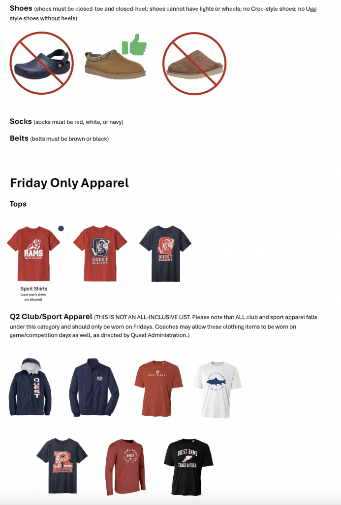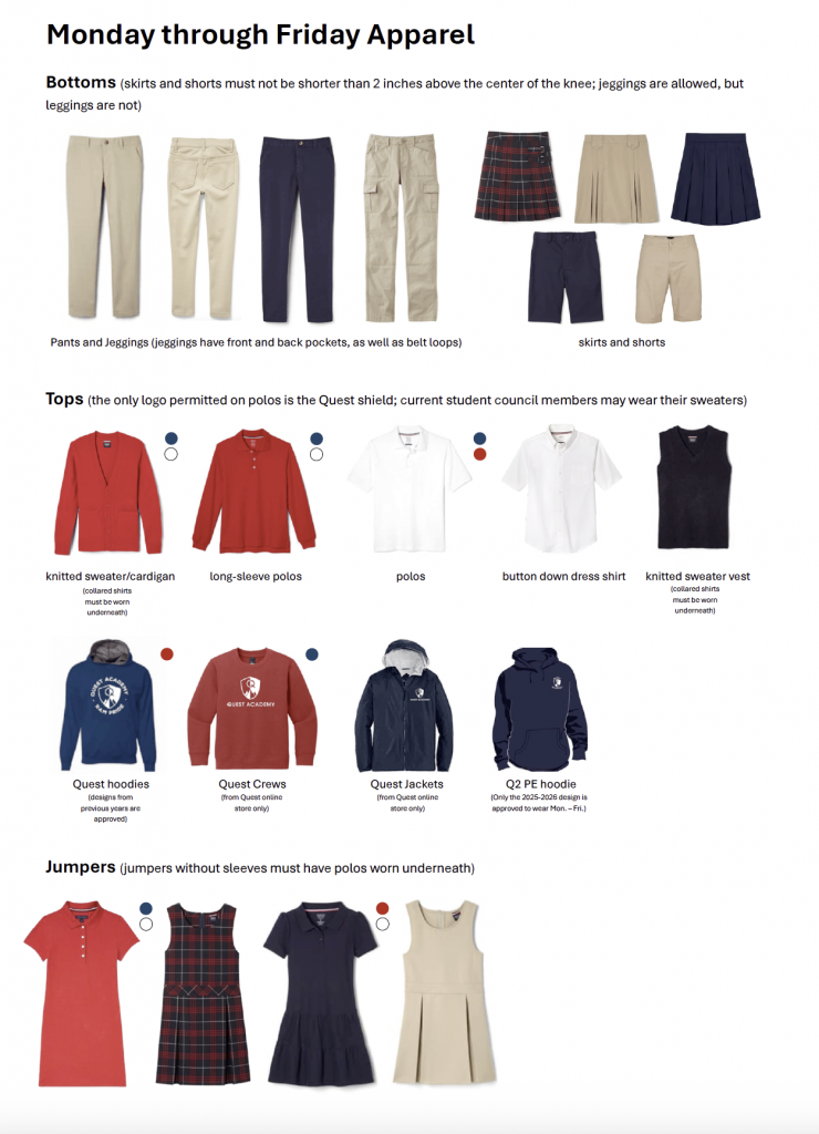 Quest Academy believes a mandatory school uniform policy will provide a more secure school environment, promote an atmosphere conducive to appropriate discipline with a minimum need for ongoing intervention and an increase in learning opportunities for students by removing many of the distractions and negative or disruptive connotations associated with various types of clothing.